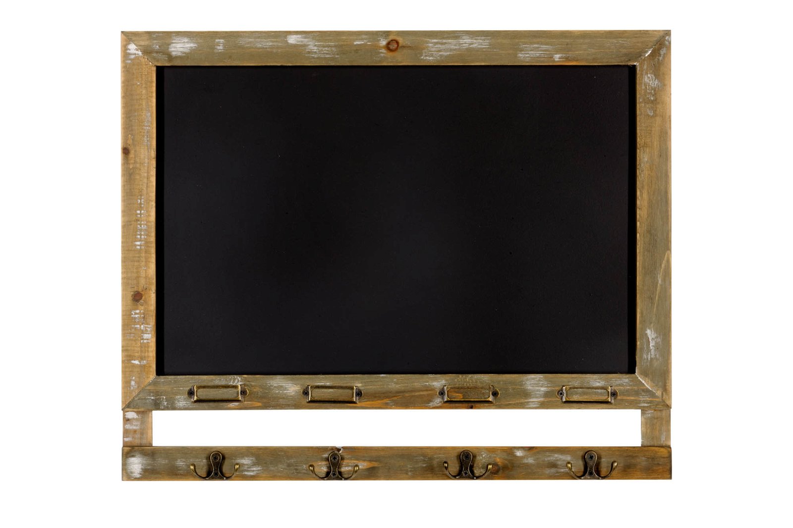 A very useful well made and stylish blackboard with an antique wooden surround complete with 4 antique brass effect metal hooks and label holders. The nameplate card insert size is 43 x 13mm with a display area of 40 x 9mm (not included). This item measures 46 x 55cm with the blackboard measuring 47 x 31cm. The gap between the blackboard surround and wood for the