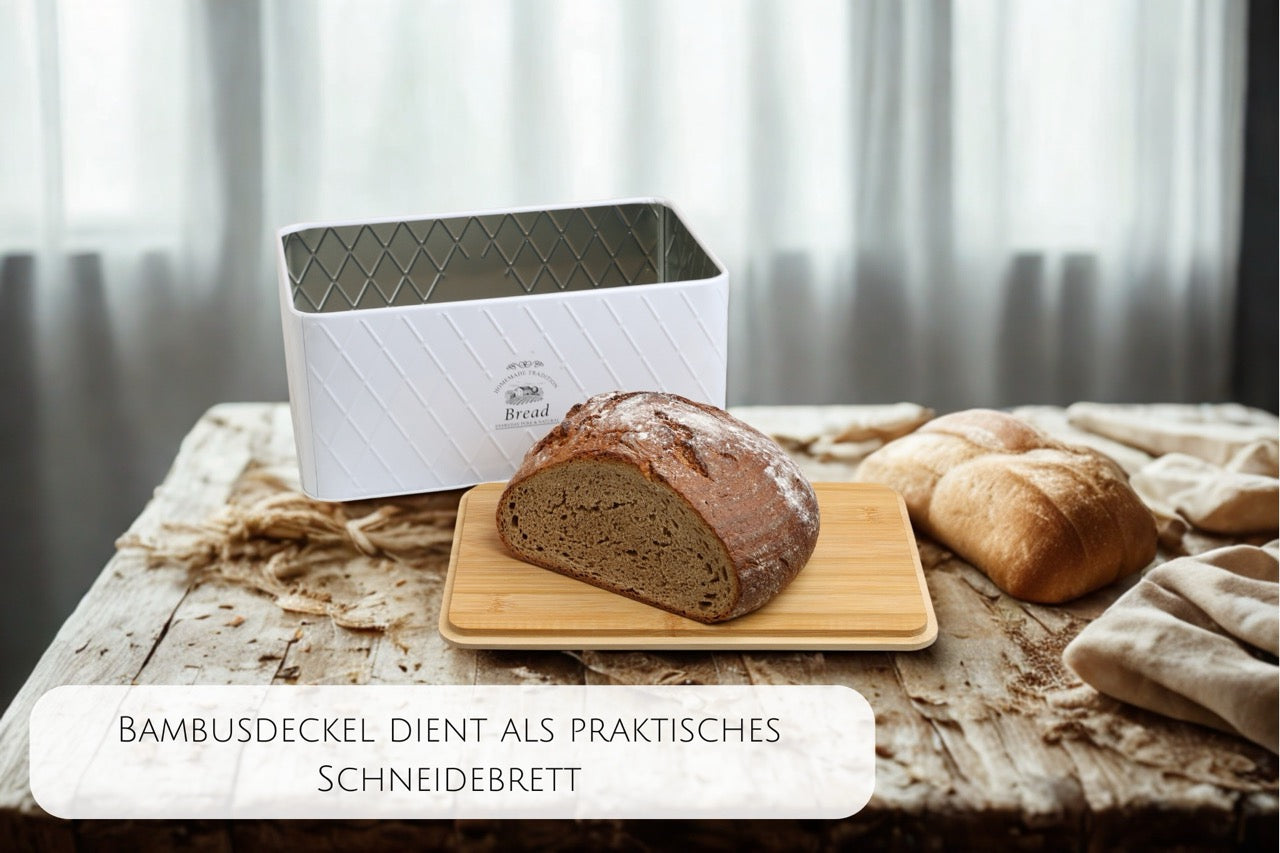 Der Airlock Brotkasten kombiniert Stil und Funktionalität, um dein Brot länger frisch zu halten. Diese Metallbox mit einem praktischen Bambusdeckel, der gleichzeitig als Schneidebrett dient, bewahrt die Frische deines Brotes für bis zu 3 bis 4 Tage. Schneide dein Brot direkt auf dem Deckel und habe dadurch Brot und Brett stets am selben Platz. Mit ihrem eleganten Design fügt sich dein Airlock nahtlos in jede Küche ein und sorgt dafür, dass dein Brot Tag für Tag weich und köstlich bleibt. Hauptmerkmale:- Hält Brot bis zu 4 Tage frisch und reduziert Lebensmittelverschwendung- Bambusdeckel dient als praktisches Schneidebrett- Stilvolles weißes Design, das zu jeder Küche passtGenieße die Frische und den Komfort des Rustic Breadvault White – eine Bereicherung für jede Küche.