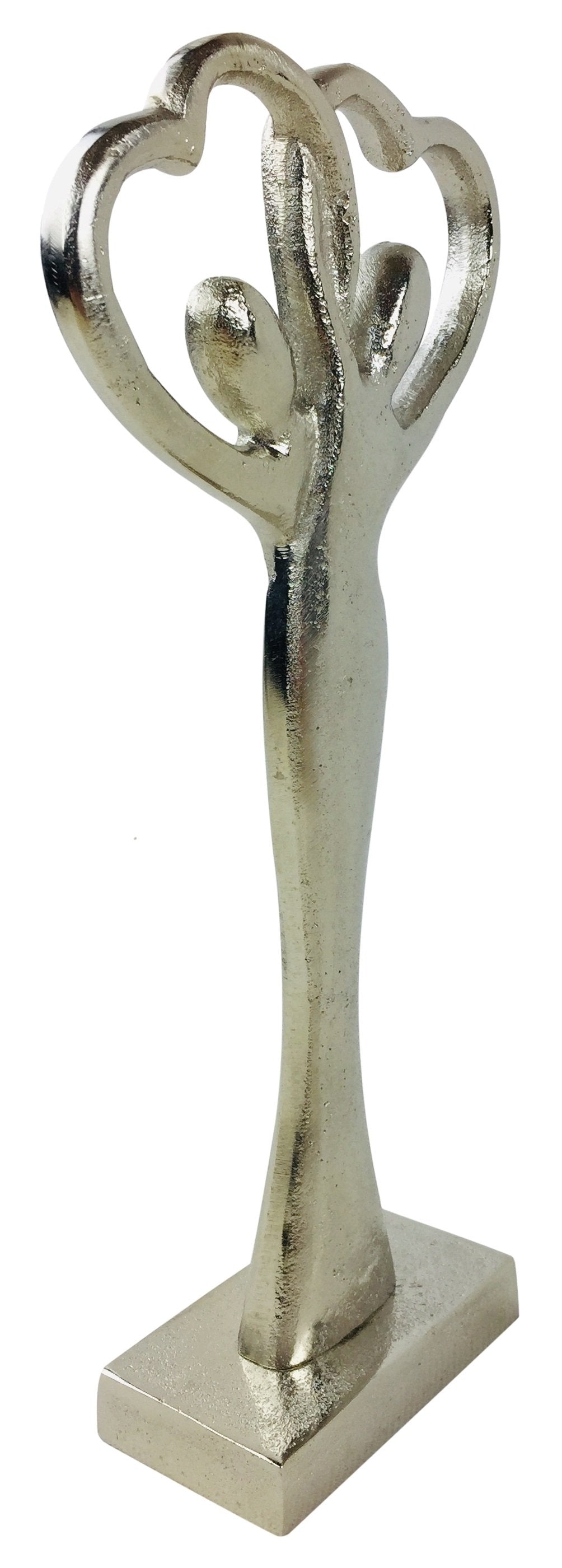 A beautiful ornament depicting a couple entwined creating a love heart with their arms together. A lovely ornament depicting love and compassion, making it a great gift idea for a loved one, or just to add character to your home setting. This ornament is made out of a robust and durable silver aluminium. Measurements: W12.5cm D5cm H27cm. The base measures 9cm x 5cm. SKU: OR1083
