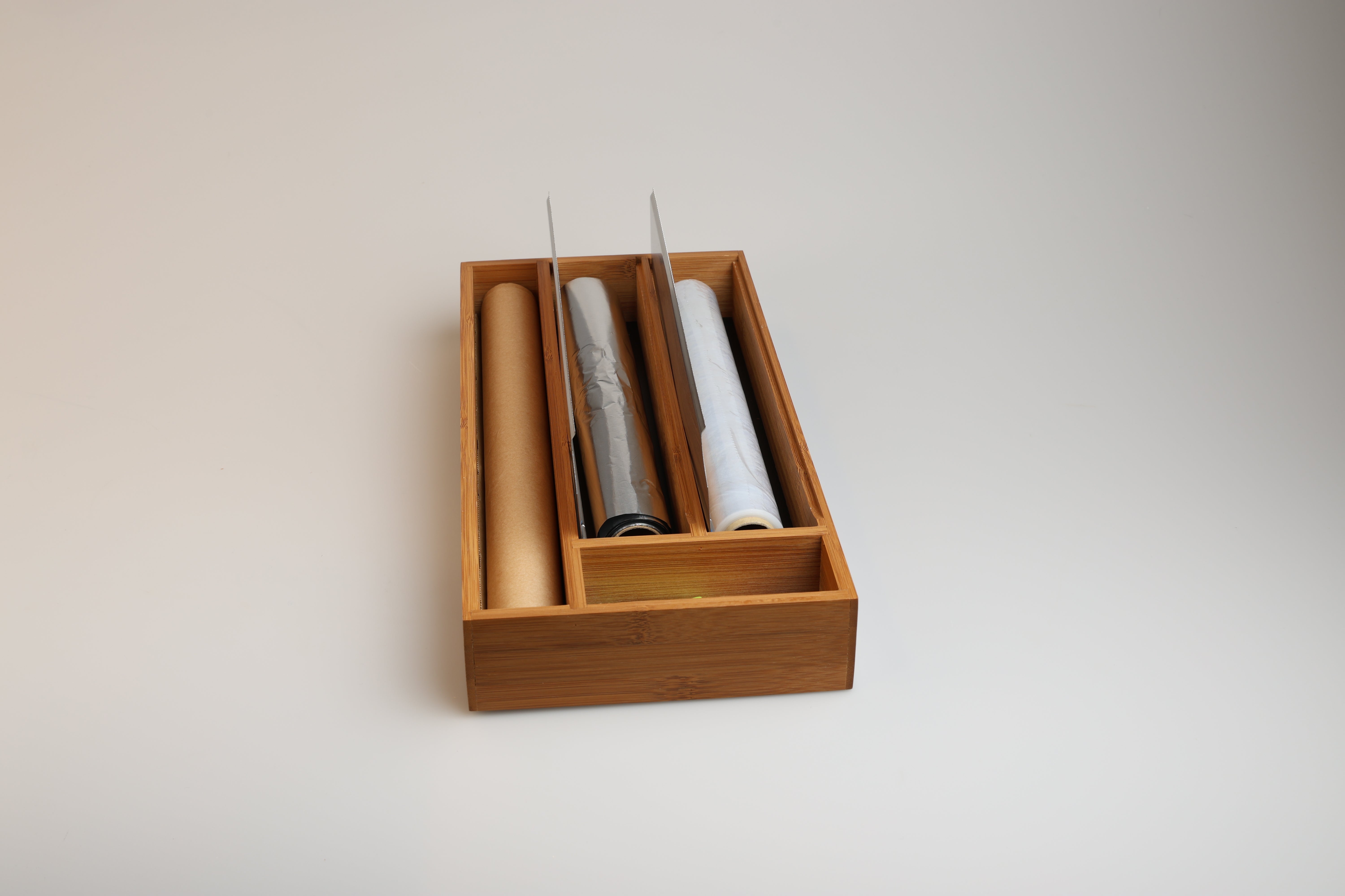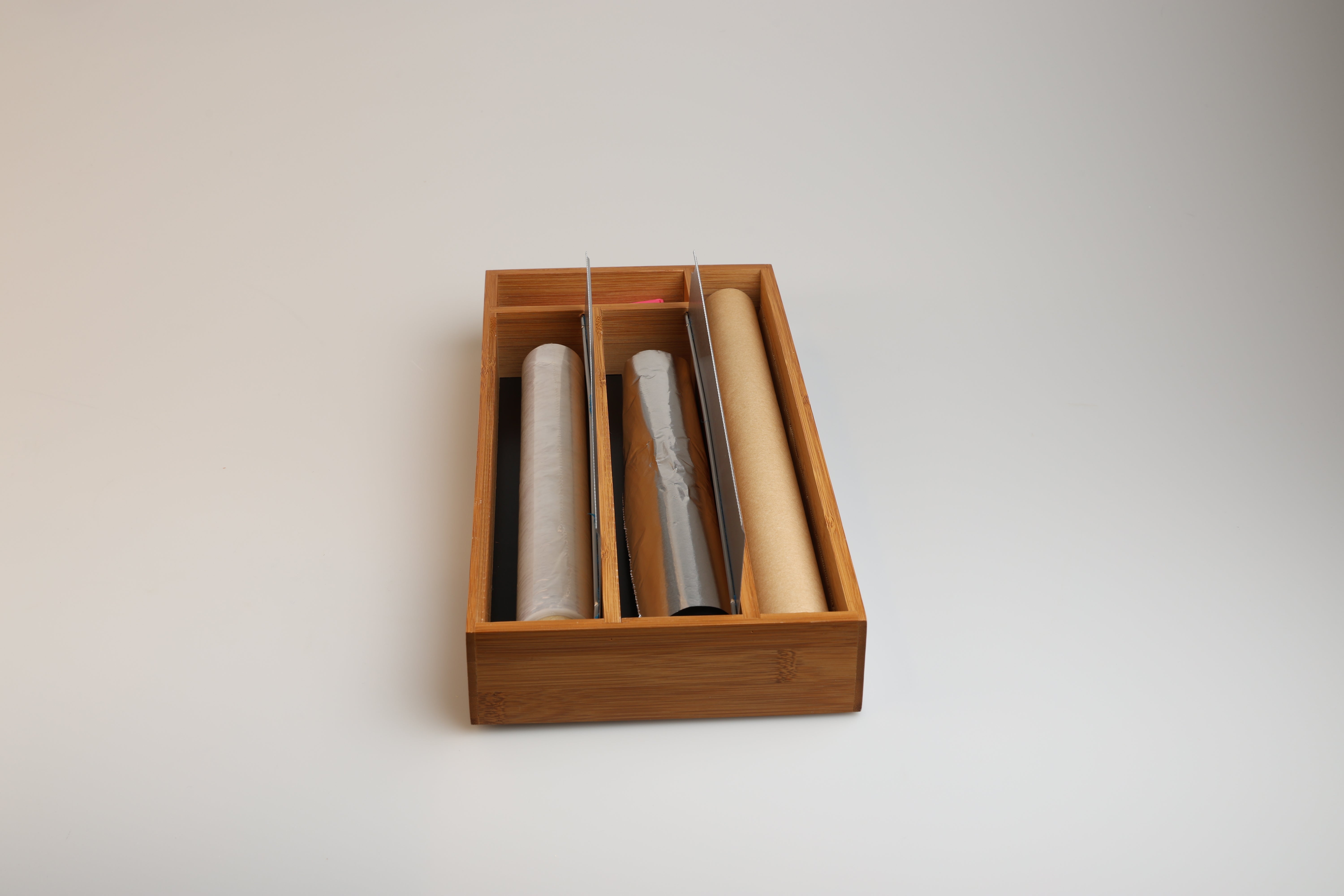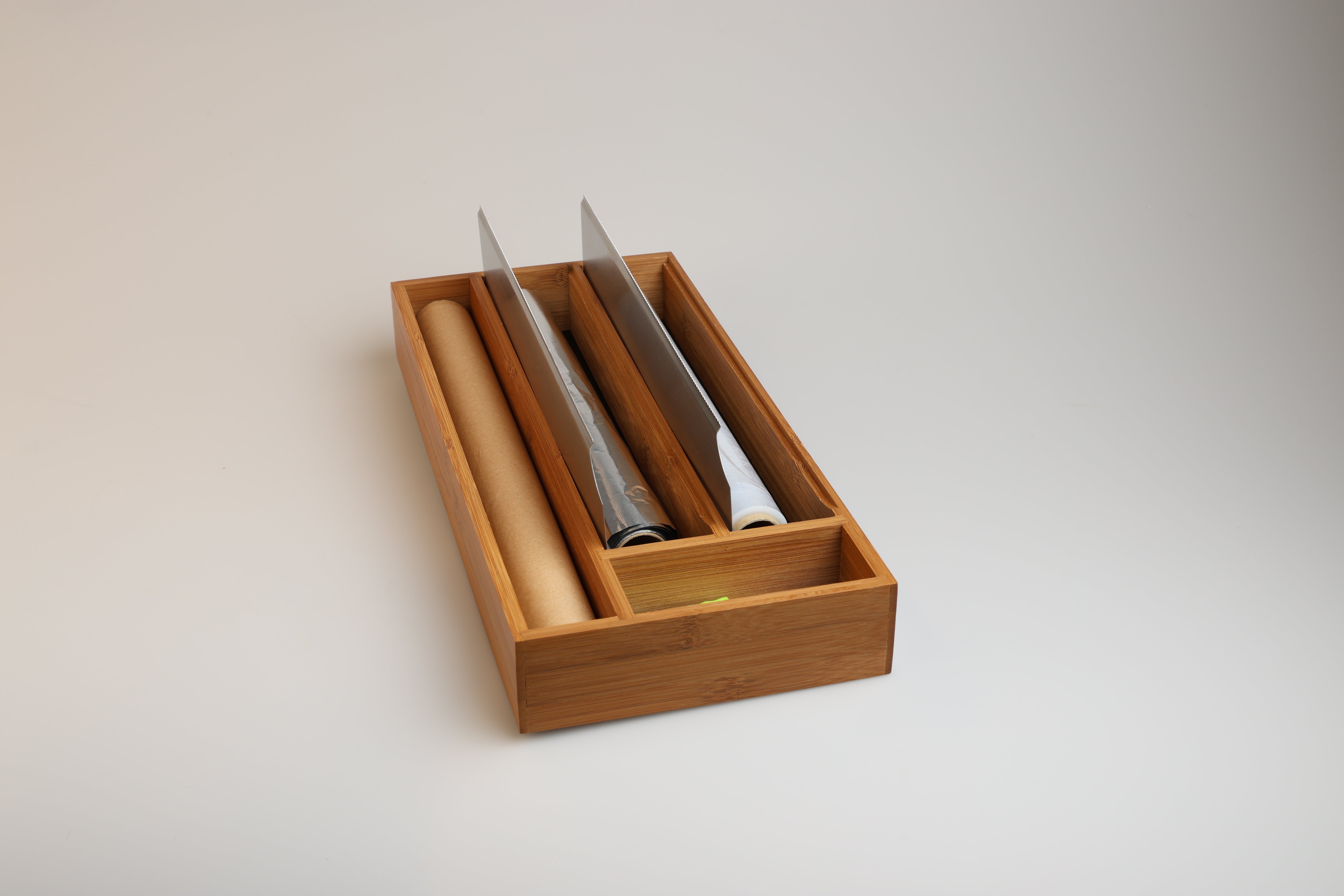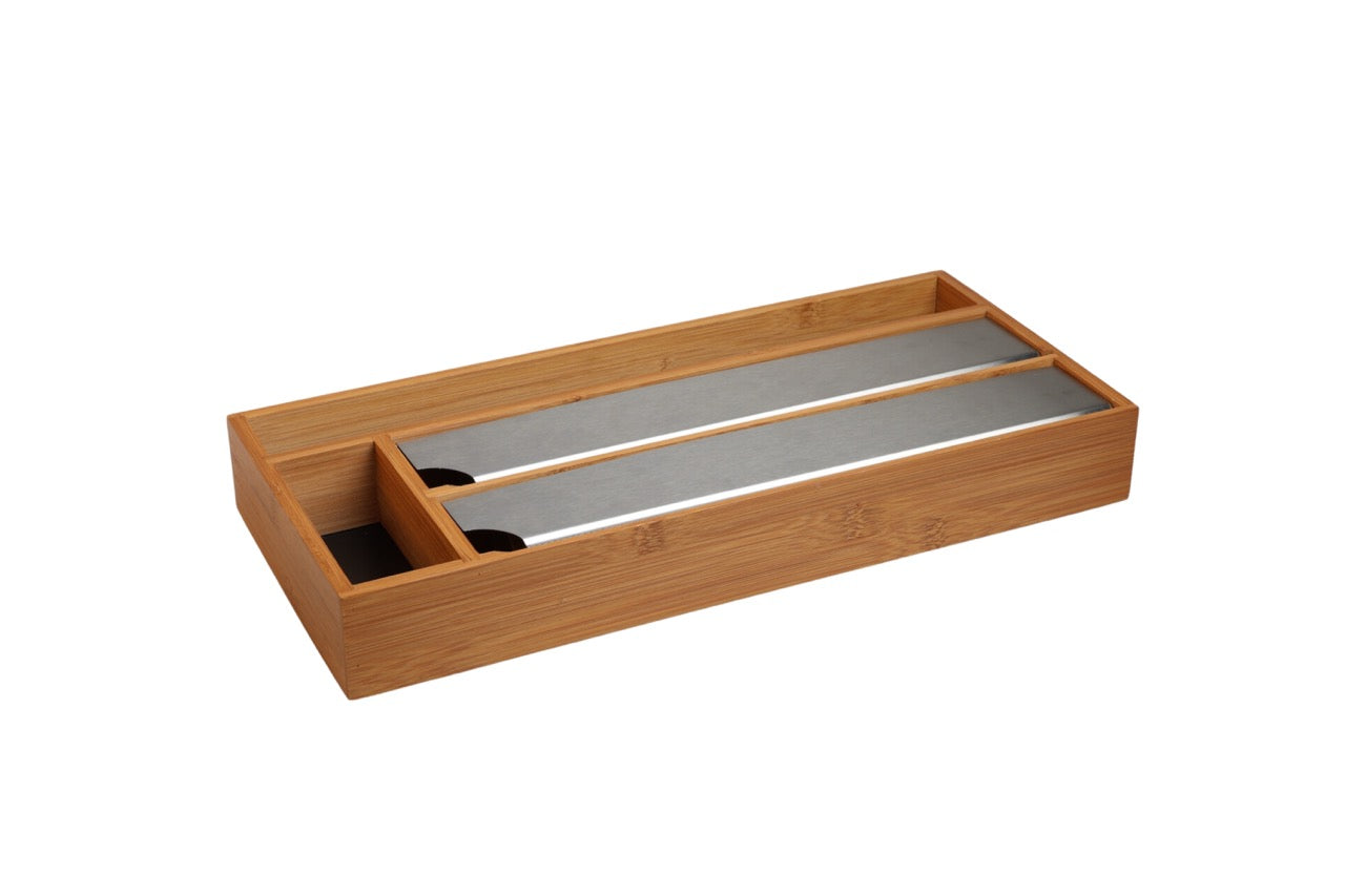 Verabschiede dich von überfüllten Schubladen mit dem Lunarfoil Folienspender. Die scharfen Kanten dieses Spenders, der für alle gängigen Größen von Folien geeignet ist, machen das Schneiden von Folien zu einem reibungslosen und mühelosen Prozess. Er ist aus langlebigem, umweltfreundlichem Bambus gefertigt und bietet die perfekte Kombination aus Funktionalität und Stil für eine gut organisierte Küche.Hauptmerkmale: – Scharfe Schneidekanten für einfaches Abschneiden von Folie – Passend für alle Standardgrößen – Mit Zusatzfach für Backpapier – Platz für Haushaltsgummis, Clips und vielem mehr – Hergestellt aus nachhaltigem Bambus, der eine natürliche Note in Ihren Raum bringtSorge für Ordnung in deinen Schubladen – Lunarfoil hilft dir, ohne viel Mühe organisiert zu bleiben.