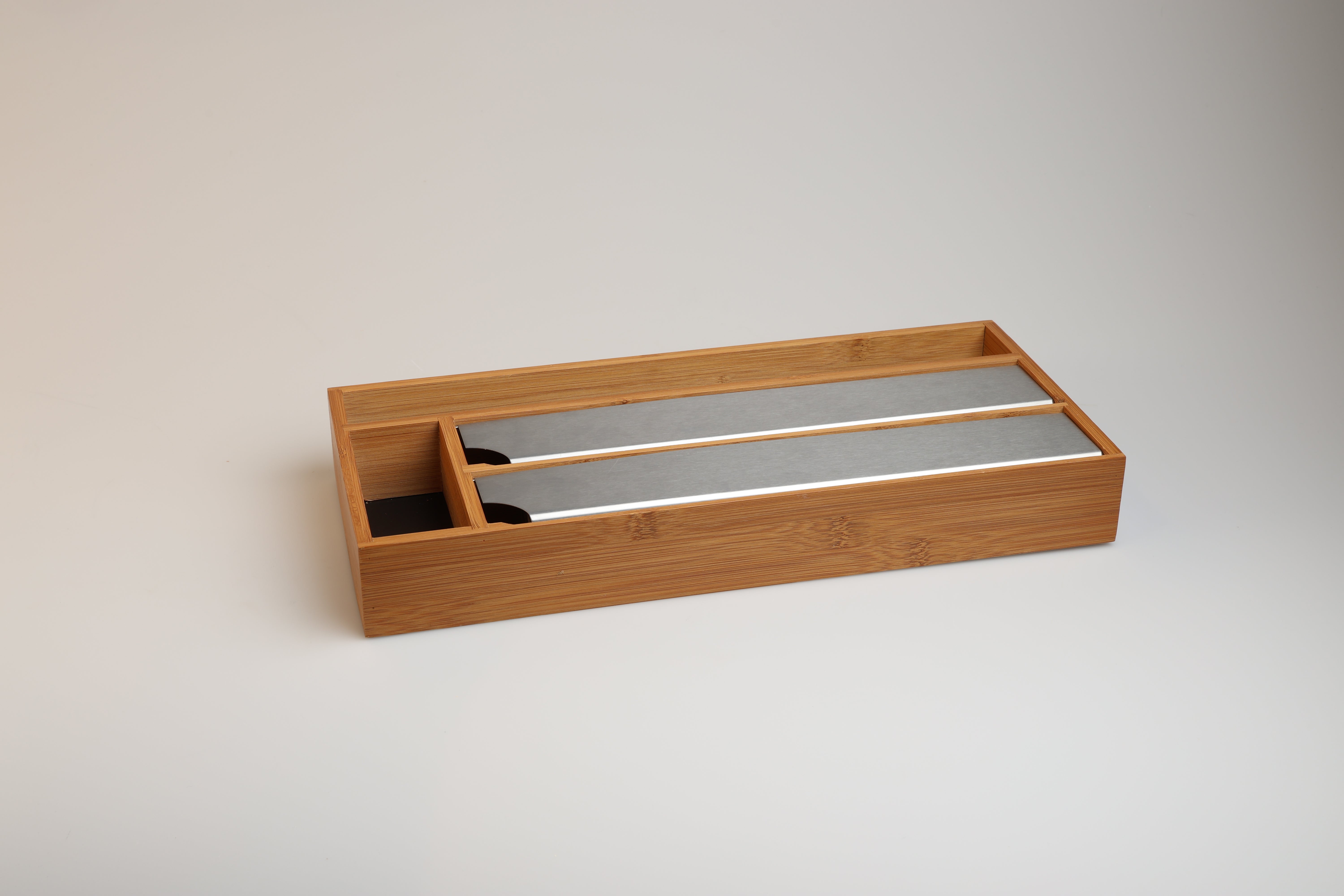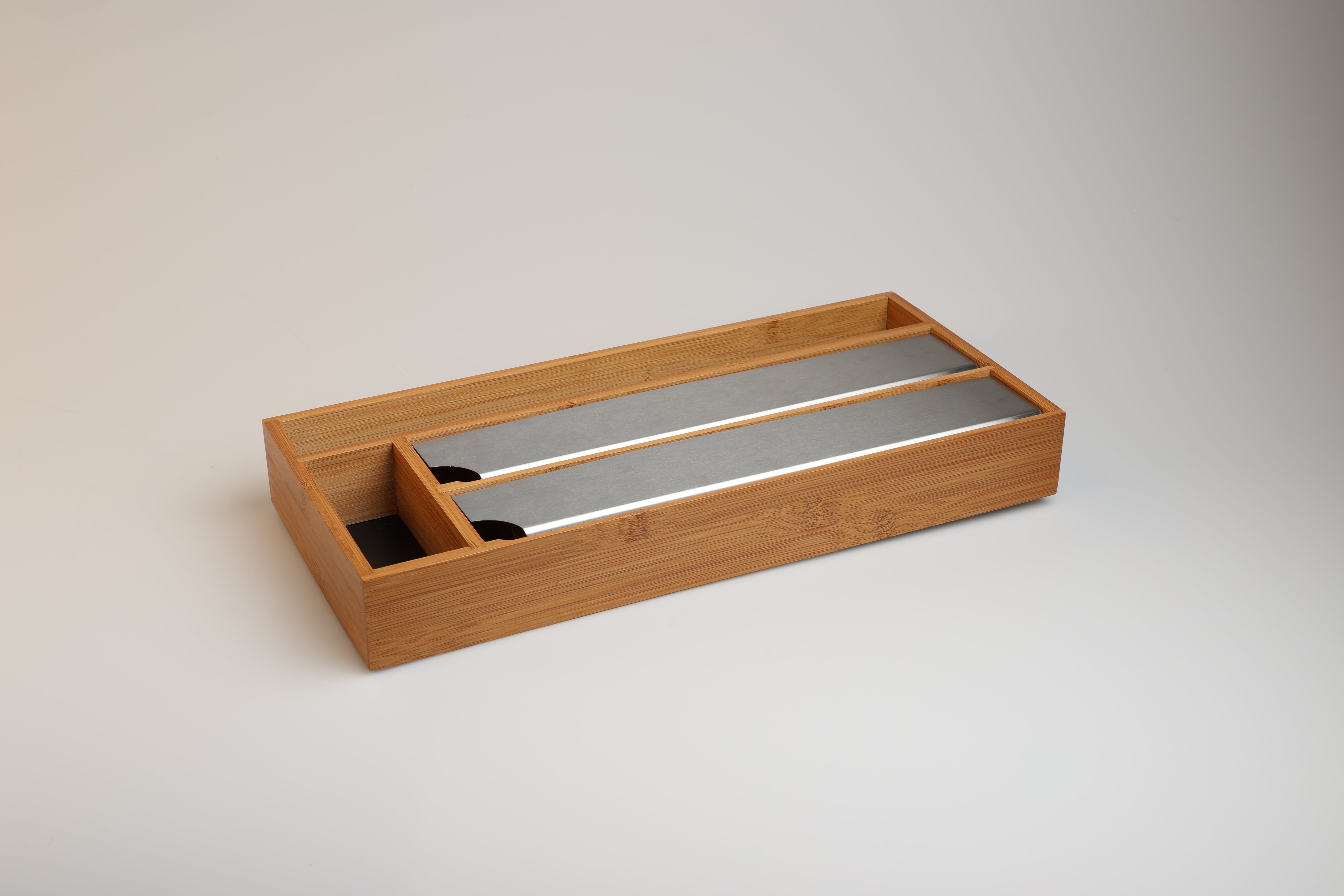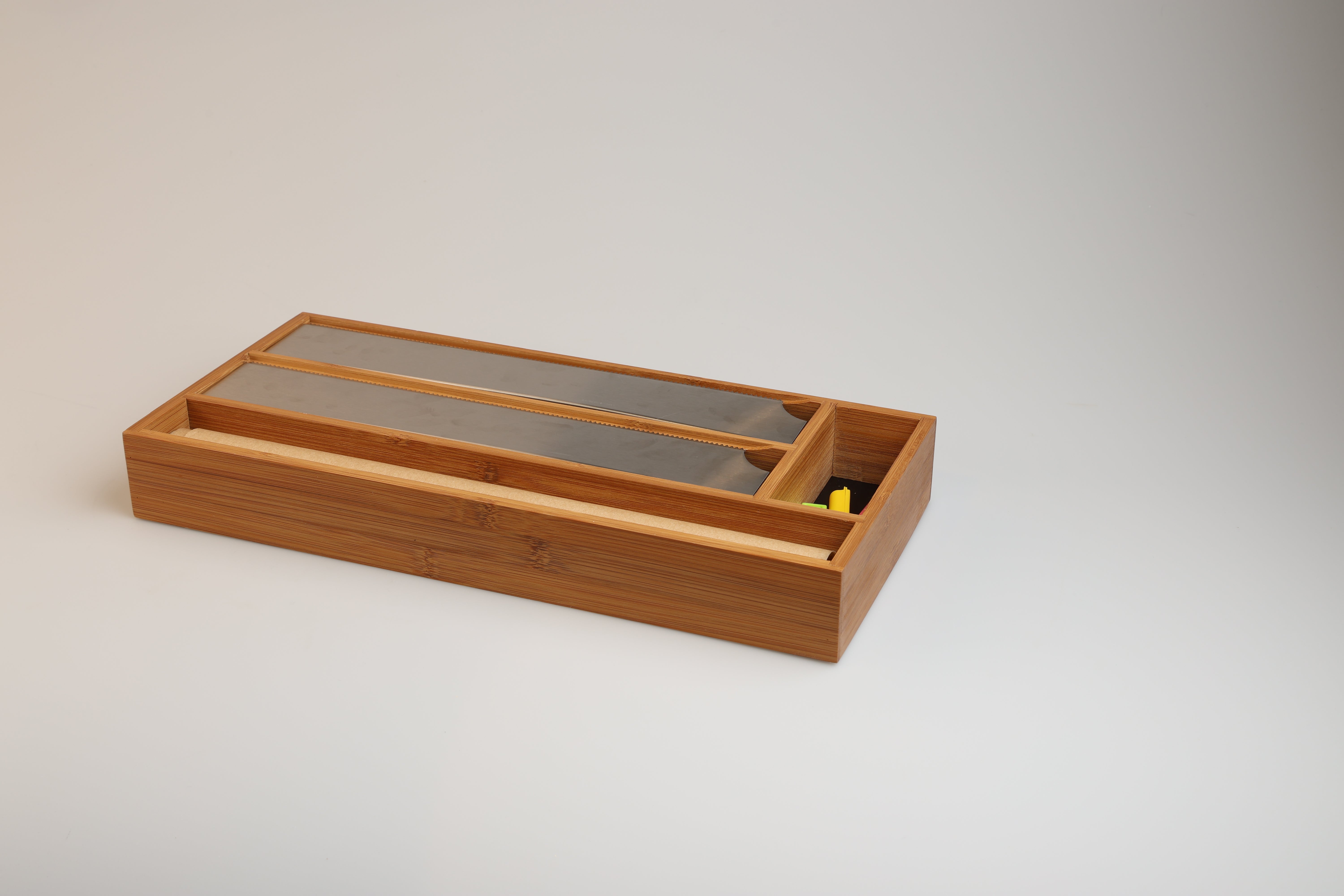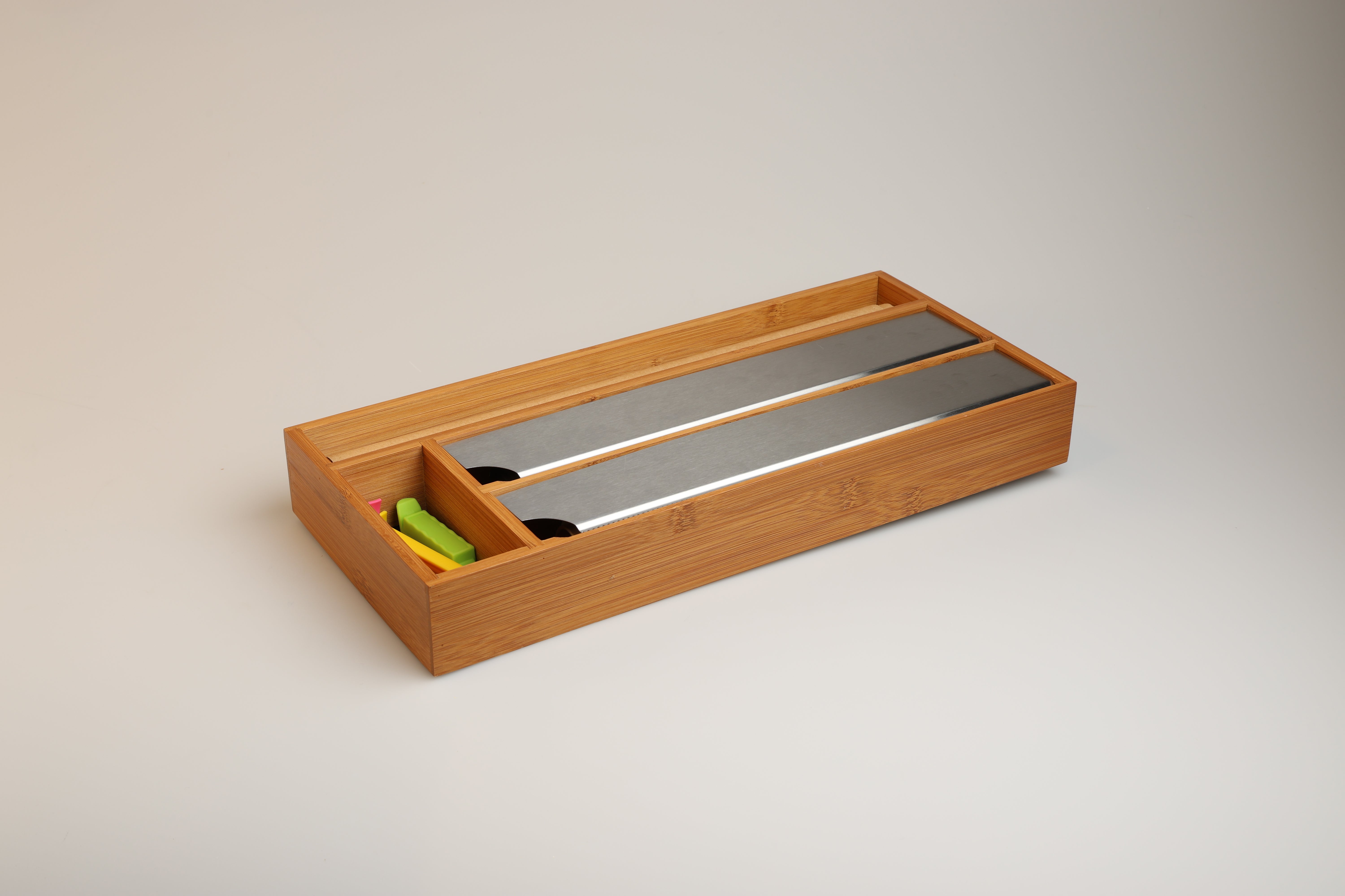 Verabschiede dich von überfüllten Schubladen mit dem Lunarfoil Folienspender. Die scharfen Kanten dieses Spenders, der für alle gängigen Größen von Folien geeignet ist, machen das Schneiden von Folien zu einem reibungslosen und mühelosen Prozess. Er ist aus langlebigem, umweltfreundlichem Bambus gefertigt und bietet die perfekte Kombination aus Funktionalität und Stil für eine gut organisierte Küche.Hauptmerkmale: – Scharfe Schneidekanten für einfaches Abschneiden von Folie – Passend für alle Standardgrößen – Mit Zusatzfach für Backpapier – Platz für Haushaltsgummis, Clips und vielem mehr – Hergestellt aus nachhaltigem Bambus, der eine natürliche Note in Ihren Raum bringtSorge für Ordnung in deinen Schubladen – Lunarfoil hilft dir, ohne viel Mühe organisiert zu bleiben.