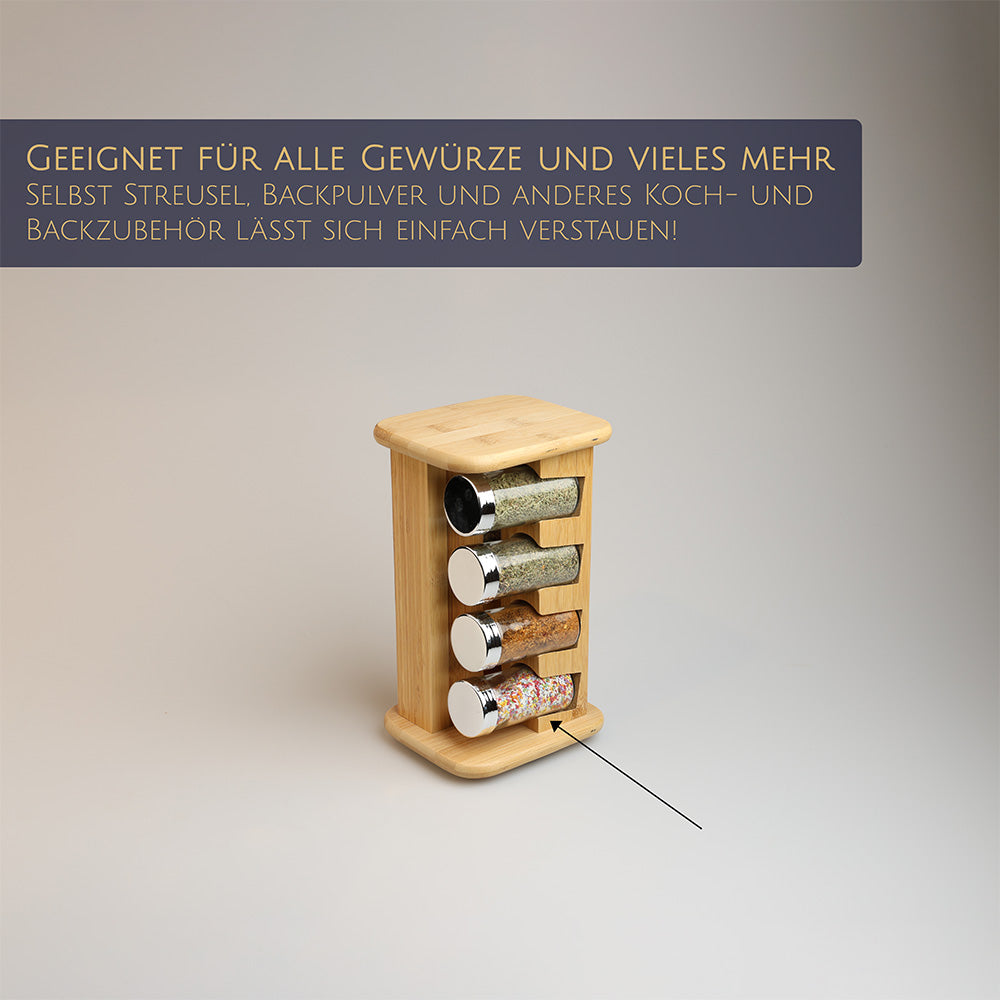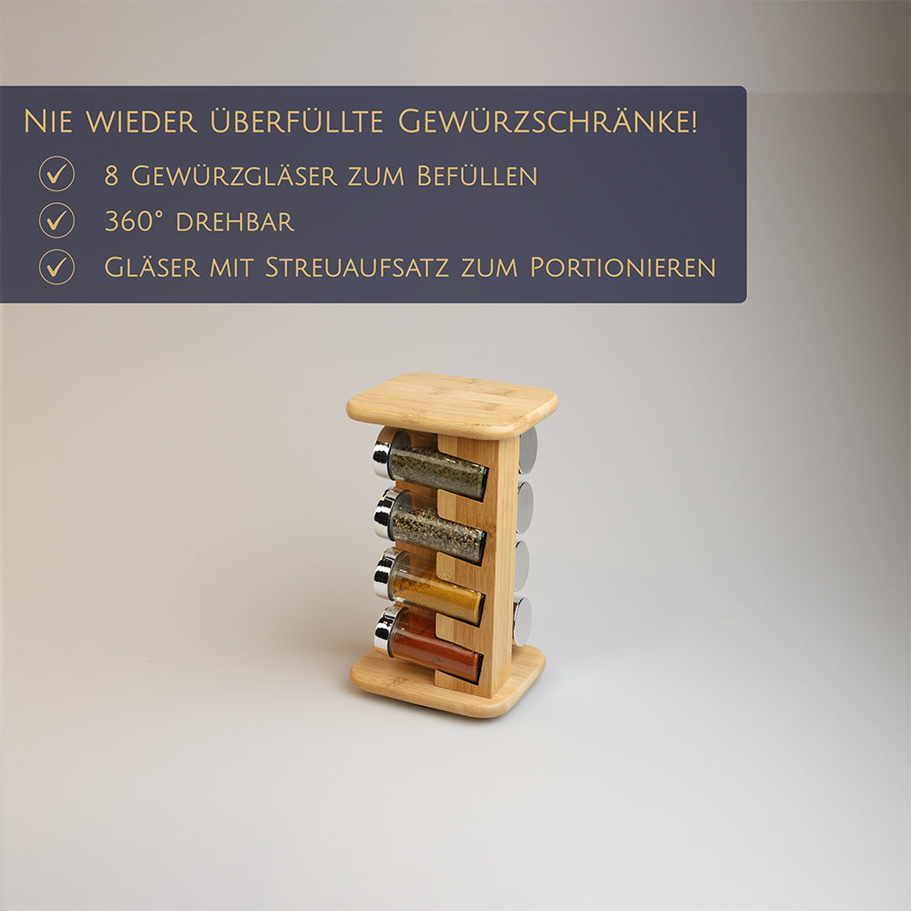Das Orbit Gewürzkarussell aus hochwertigem Bambus bringt Ordnung und Stil in deine Küche. Mit acht individuell befüllbaren Gläsern (je 90 ml Fassungsvermögen) hast du alle Gewürze immer griffbereit. Der kugelgelagerte Drehteller sorgt für eine leichtgängige 360°-Drehung, sodass du schnell das passende Gewürz findest. Alle Gläser sind spülmaschinengeeignet und lassen sich einfach reinigen. Hauptmerkmale: – Nachhaltiges Bambusmaterial: Umweltfreundlich und dekorativ – 8 Nachfüllbare Gläser: Perfekt organisiert für deine Lieblingsgewürze – Leichtgängiger Drehteller: Einfaches Finden dank 360°-Drehung – Spülmaschinengeeignete Gläser: Leichte Reinigung für mehr KomfortBringe deinen Gewürzschrank auf ein neues Level mit dem Orbit Gewürzkarussell. Lieferumfang: 1x Gewürzkarrussel, 8x unbeschriftete, leere Gläser