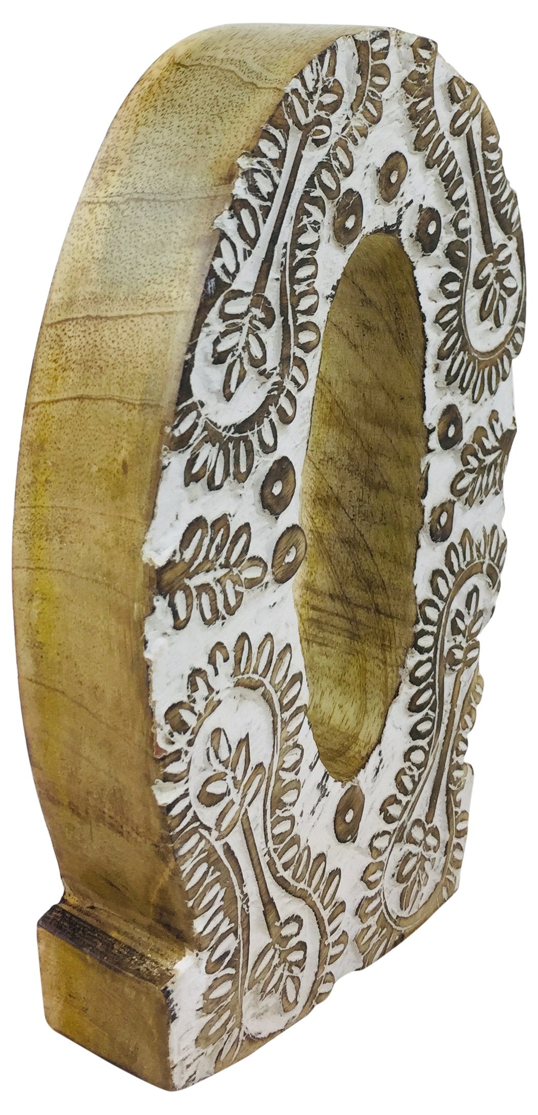 A solid hand carved mango wood letter O. The letter features an intricate white flower design which is hand carved into the letter. The letter has overall rustic look and would fit perfectly into a variety of sceneries. The letter is free standing or can be wall mounted via the hanging bracket on the back. Perfect for new baby’s, kid’s bedrooms, christening, engagement presents, wedding’s, birthday’s, and bars or cafes. Measurements: W14cm X D4.5cm XH21cm. Weight: 0.48kg.