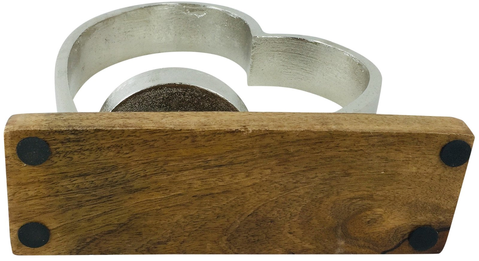 A tea light holder with a lovely simple heart design. A great gift idea for your loved ones! The tea light is made out of aluminium with a lovely solid mango wood for the base, making the product robust and durable. There are four pads on the bottom to prevent scratching surfaces and movement. Measurements: W28cm D8.7cm H28cm. The base footprint is 15.2cm x 9cm. The candle holders internal diameter is 8cm. SKU: CH6111