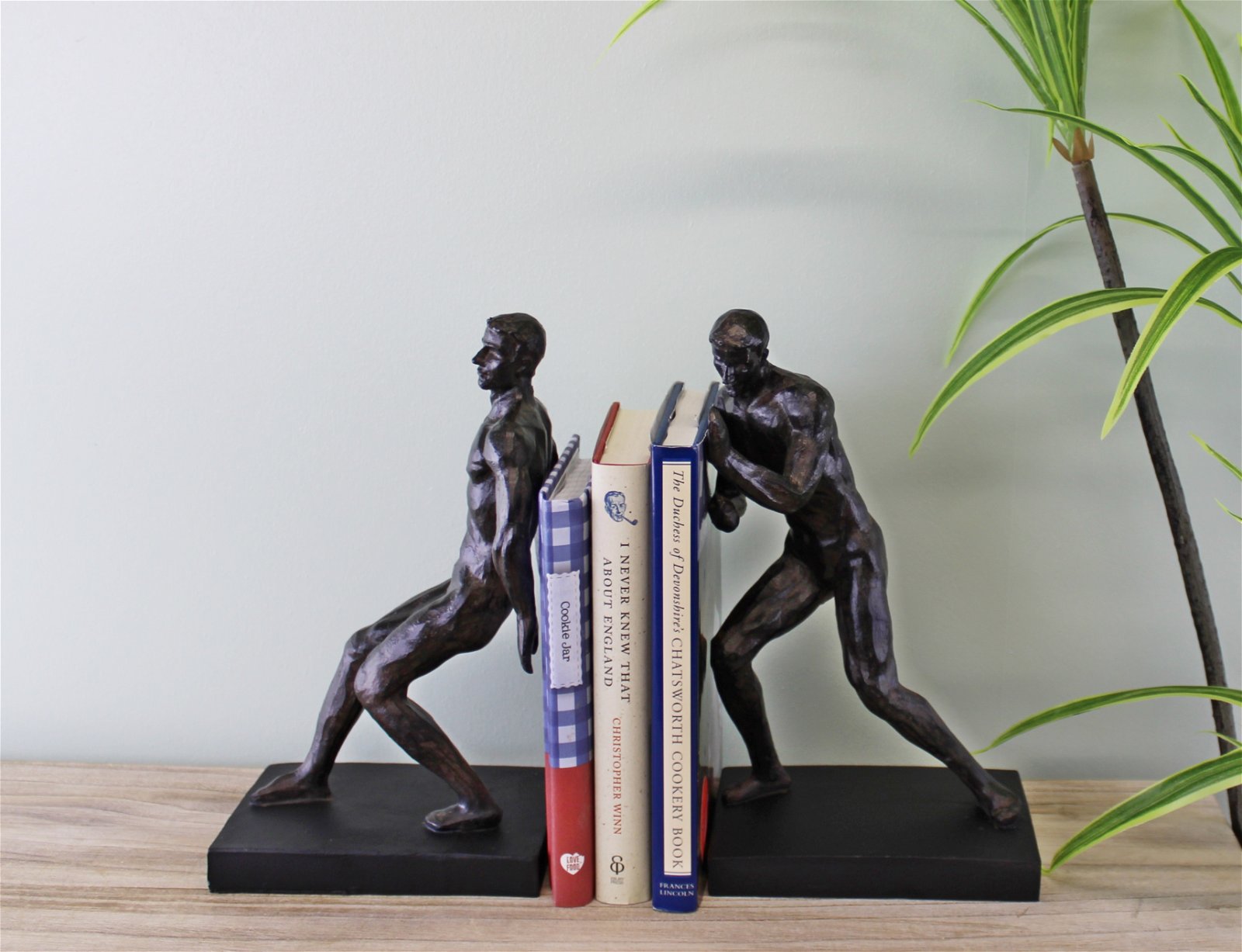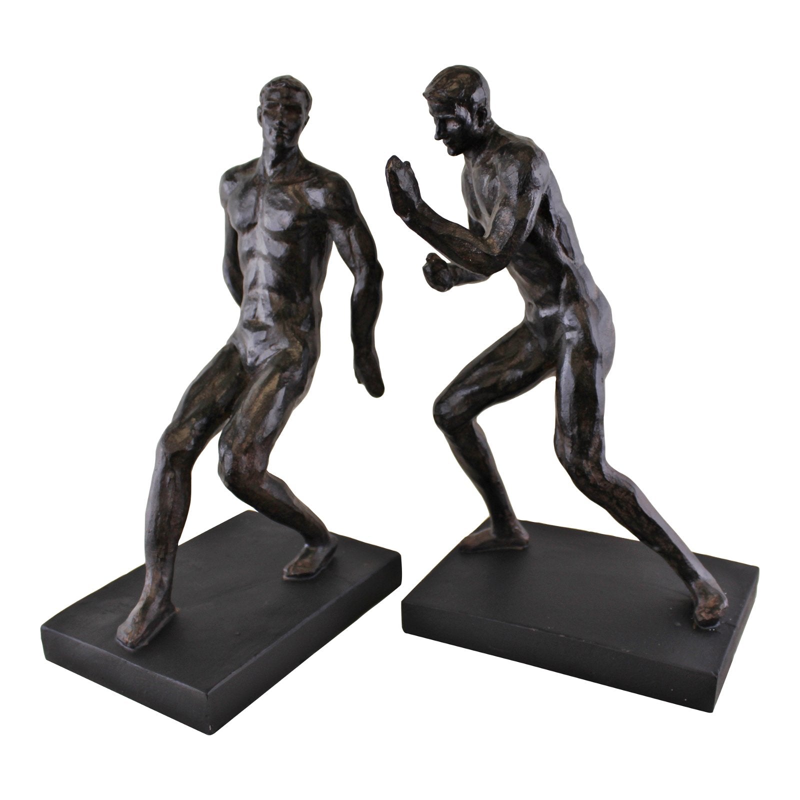 A pair of male statue bookends, perfect addition to a bookcase or mantelpiece. Very detailed casting with a bronzed effect finish on a black rectangular base. Made of 100% polyresin. Measurements: 11 x 27 x 31cm SKU: OR0608