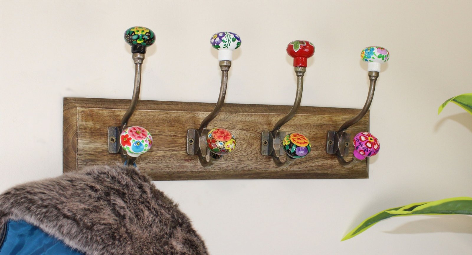 Stylish and ornamental, these Mexican floral inspired wall hooks make a functional item beautiful. Iron hooks with ceramic knobs on a wooden base. Measurements: 13 x 18 x 44.5cm SKU: TJNM0023