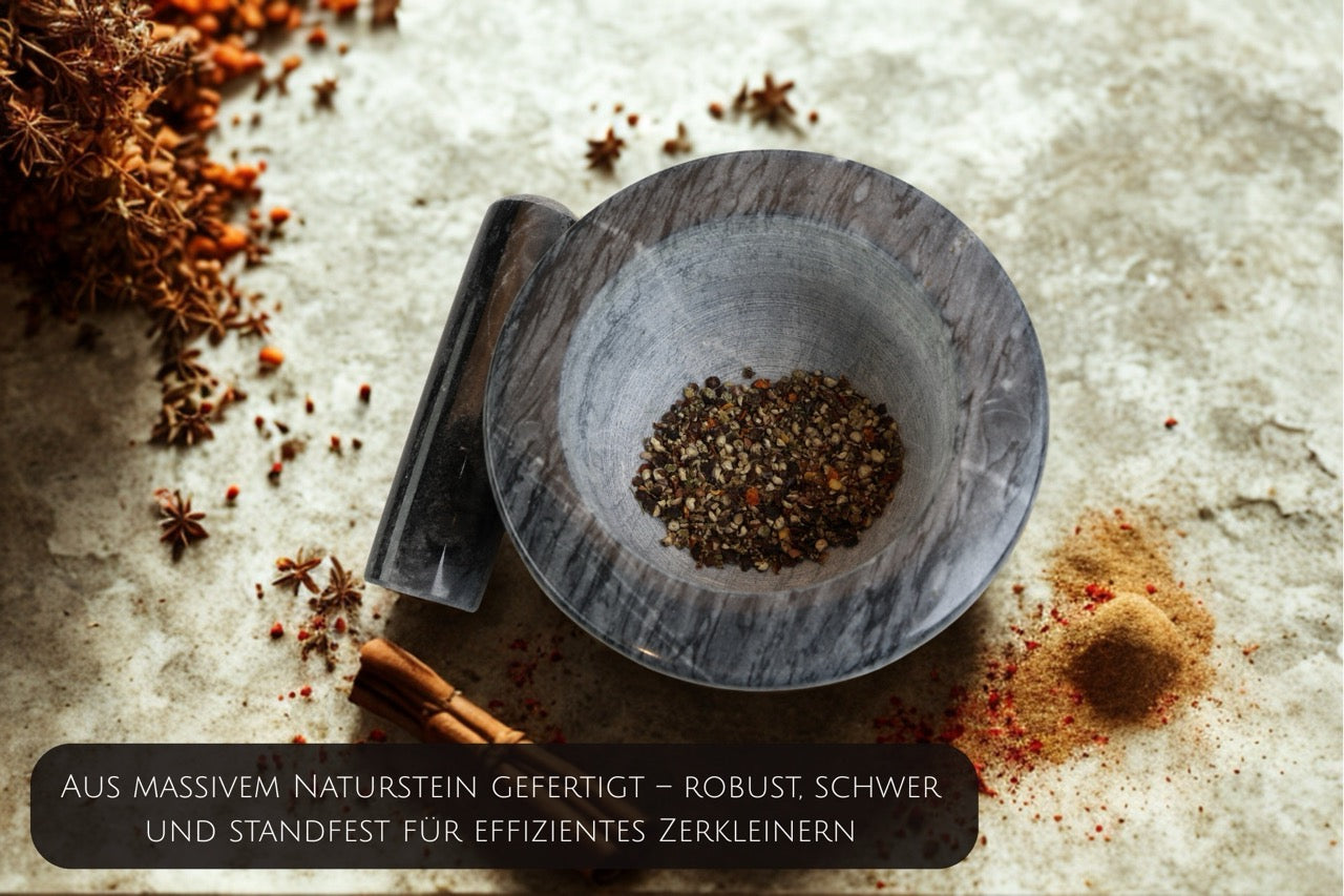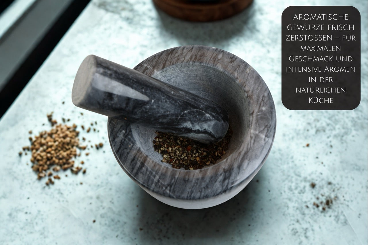 Verleihe deiner Küche einen Hauch von Eleganz mit dem Mörser Meteor. Aus echtem Marmor gefertigt, verbindet er edles Design mit außergewöhnlicher Funktionalität. Der schwere Mörser und Stößel sorgen für optimale Standfestigkeit und machen das Zerkleinern von Gewürzen, Kräutern und Nüssen mühelos. Egal, ob du eigene Marinaden, Pasten oder Gewürzmischungen herstellen möchtest der geschmacksneutrale Marmor bewahrt die natürlichen Aromen deiner Zutaten.Hauptmerkmale: – Hochwertiges Material: Gefertigt aus langlebigem, ästhetischem Marmor – Stabile Basis: Schwerer Fuß für sicheren Halt beim Arbeiten – Aromaschutz: Nicht-poröse Oberfläche garantiert reine Geschmacksentfaltung – Vielseitig einsetzbar: Perfekt für Gewürzmischungen, Pasten, Marinaden und mehr – Maße: Mörser – D 13.0cm, H 8.0cm, Stößel – D 4.0cm, L 8.0cmMit dem Mörser Meteor bringst du nicht nur Funktion, sondern auch Stil in deine Küche – für aromatische und meisterhafte Gerichte.