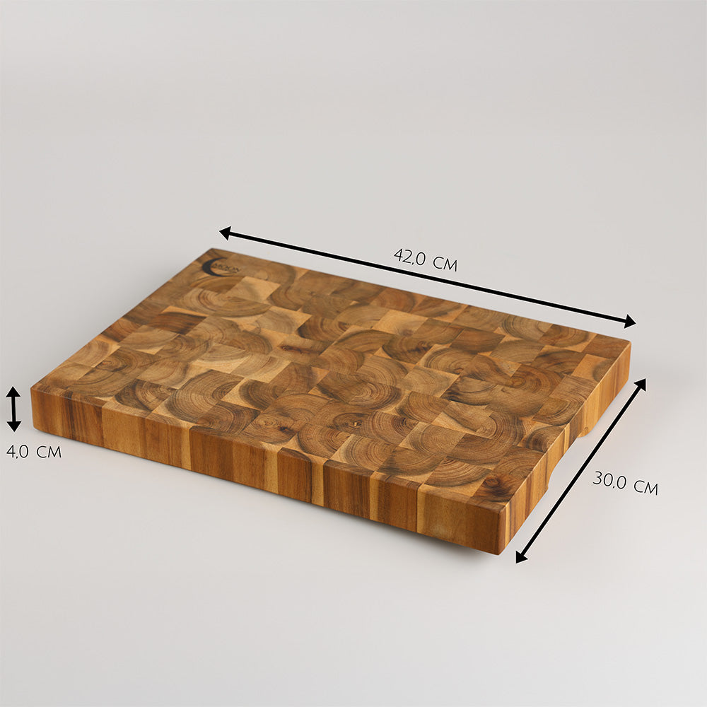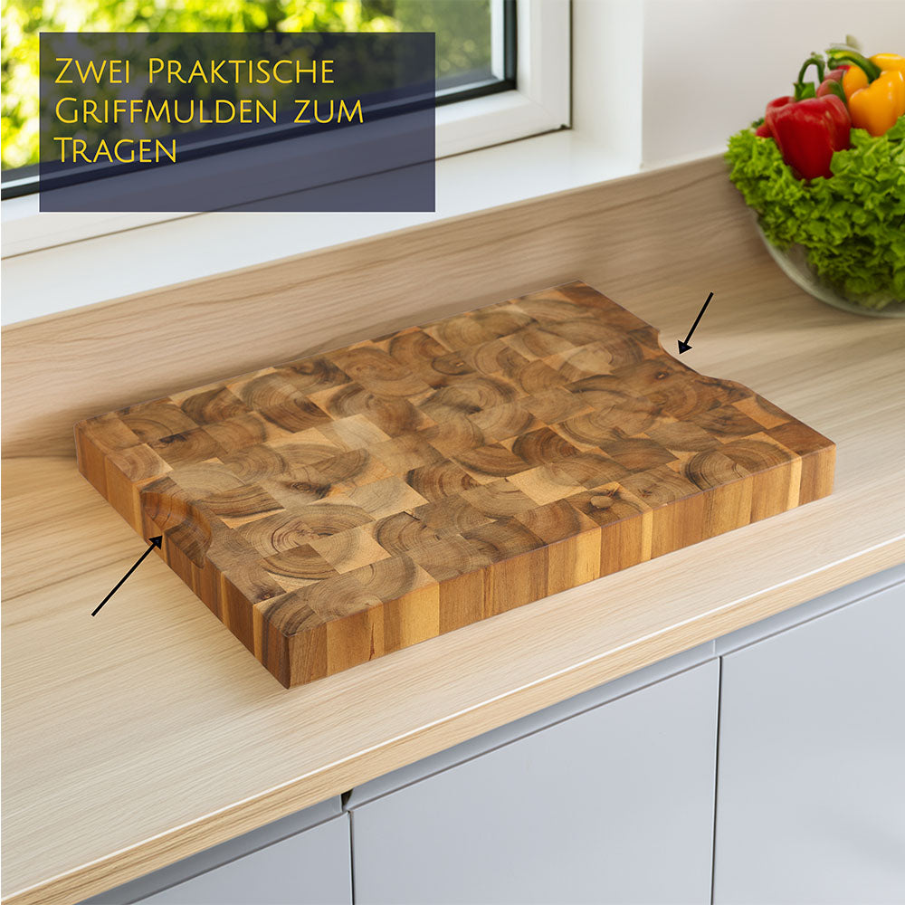 Das Uranus Schneidebrett aus hochwertigem Akazienholz ist ein Muss für ambitionierte Hobby-Köche. Mit einer beeindruckenden Dicke von 4 cm bietet es eine stabile und langlebige Unterlage für jede Schneidarbeit. Die großzügige Schnittfläche eignet sich ideal für das Zubereiten von Fleisch, Gemüse und zum Hacken von Nüssen. Durch die Stirnholzverleimung im Mosaikmuster erhält das Brett einen edlen und individuellen Look und ist gleichzeitig funktional und dekorativ.Hauptmerkmale: – Extra dick mit 4,0 cm für Stabilität und Langlebigkeit – Großzügige Schnittfläche, ideal für vielseitige Küchenarbeiten – Stirnholzverleimung für ein edles und einzigartiges Design – Hergestellt aus hochwertigem Akazienholz, perfekt für intensive NutzungErlebe ein einzigartiges Schneiderlebnis mit dem Uranus Schneidebrett – die perfekte Verbindung von Funktion und Stil für jede Küche.