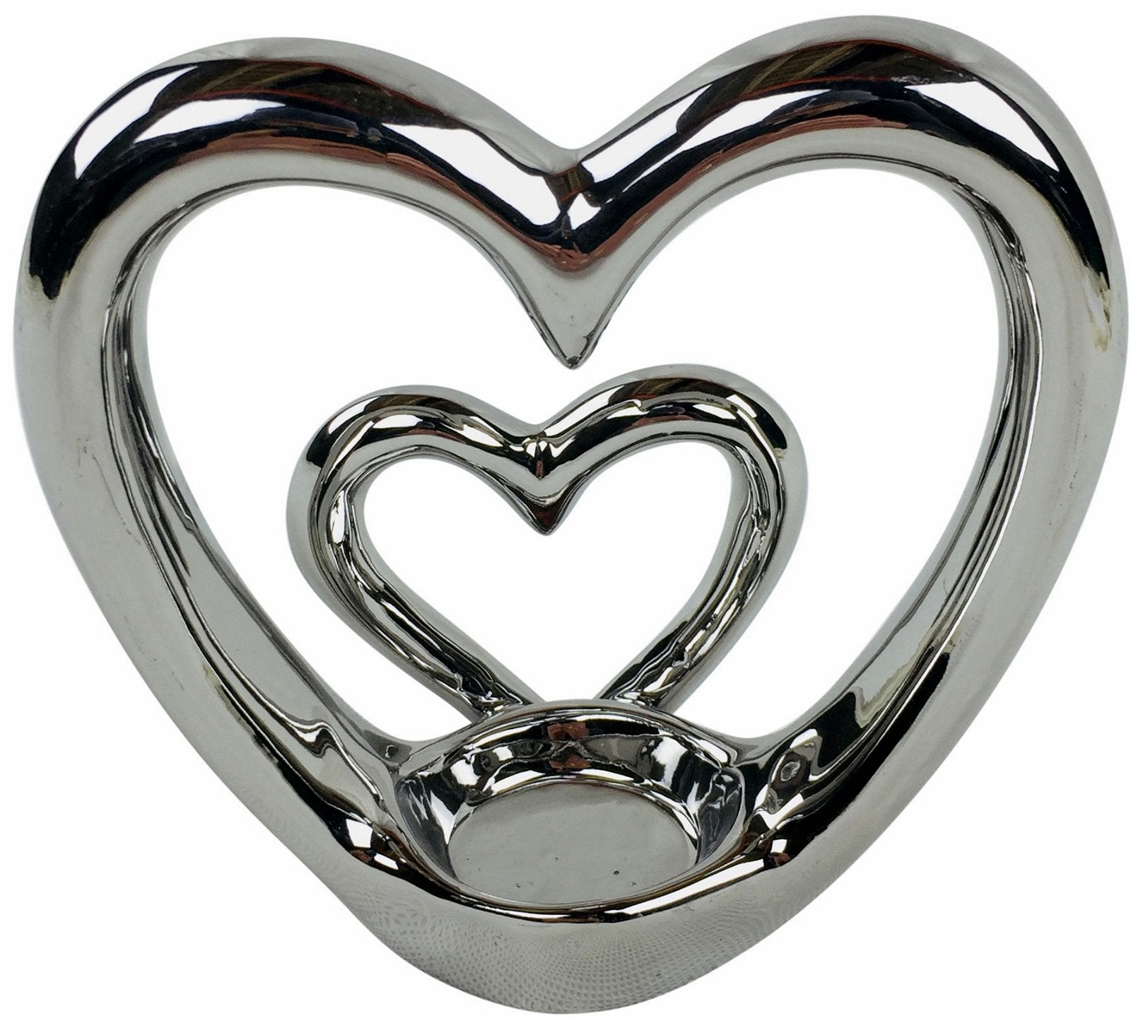 The hearts are made of ceramic with a beautiful chrome finish. The product has 4 raised pads underneath to prevent scratching on the surface. Candle holder diameter is 5cm. Measurements: W14.5cm x D6.5cm x H14cm. The footprint is 6.5cm x 6.5cm. SKU: CH5966