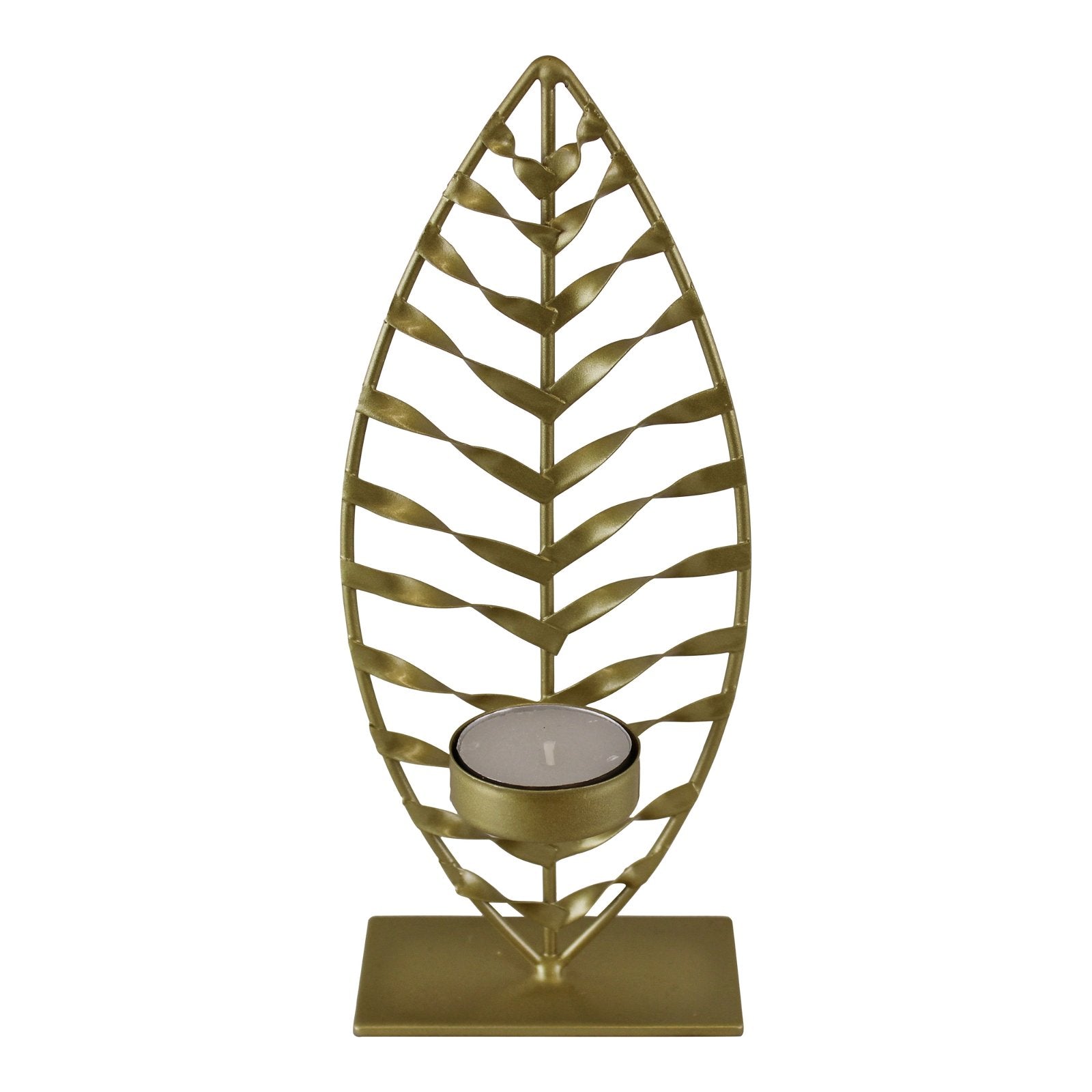 A small gold metal tea light holder in the shape of a leaf. Holder is made of metal and tea light candle is included. Measurements: 7 x 22 x 9cm SKU: CH6073