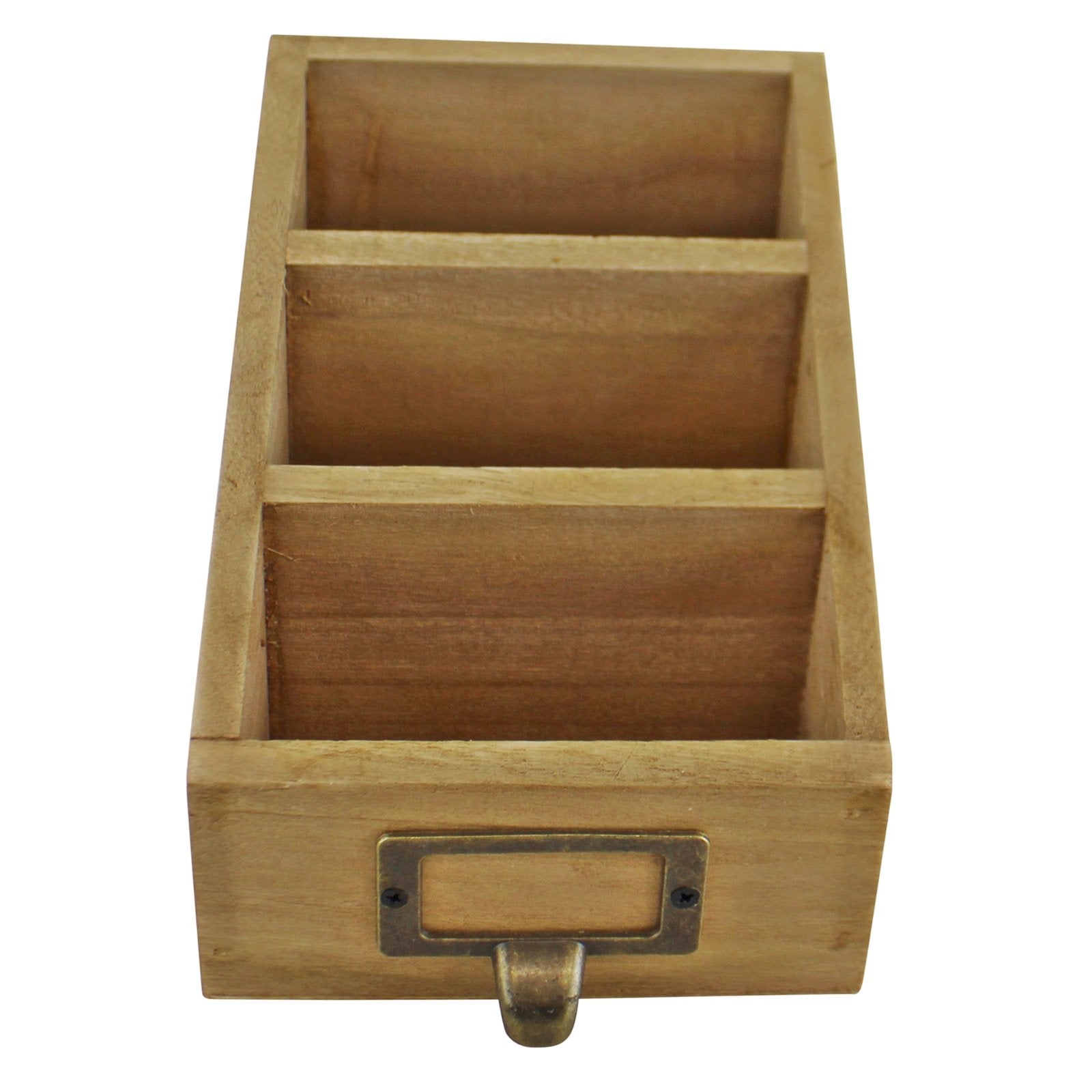 This product co-ordinates perfectly with our classic trinket drawers and features 3 slots for storing desktop items. There is also a handy space to the front for a label to be inserted into. Made of Firwood with a metal slot to the front. Measurements: Depth 19 x Height 10 x Width 12cm. Internal measurements of the slots are 10cm wide and 5cm deep, the front slot is 5cm high, middle slot 8cm high and rear slot 10cm high. The nameplate card insert size is 4.5 x 2.5cm with a display area of 4 x 2cm (not included).