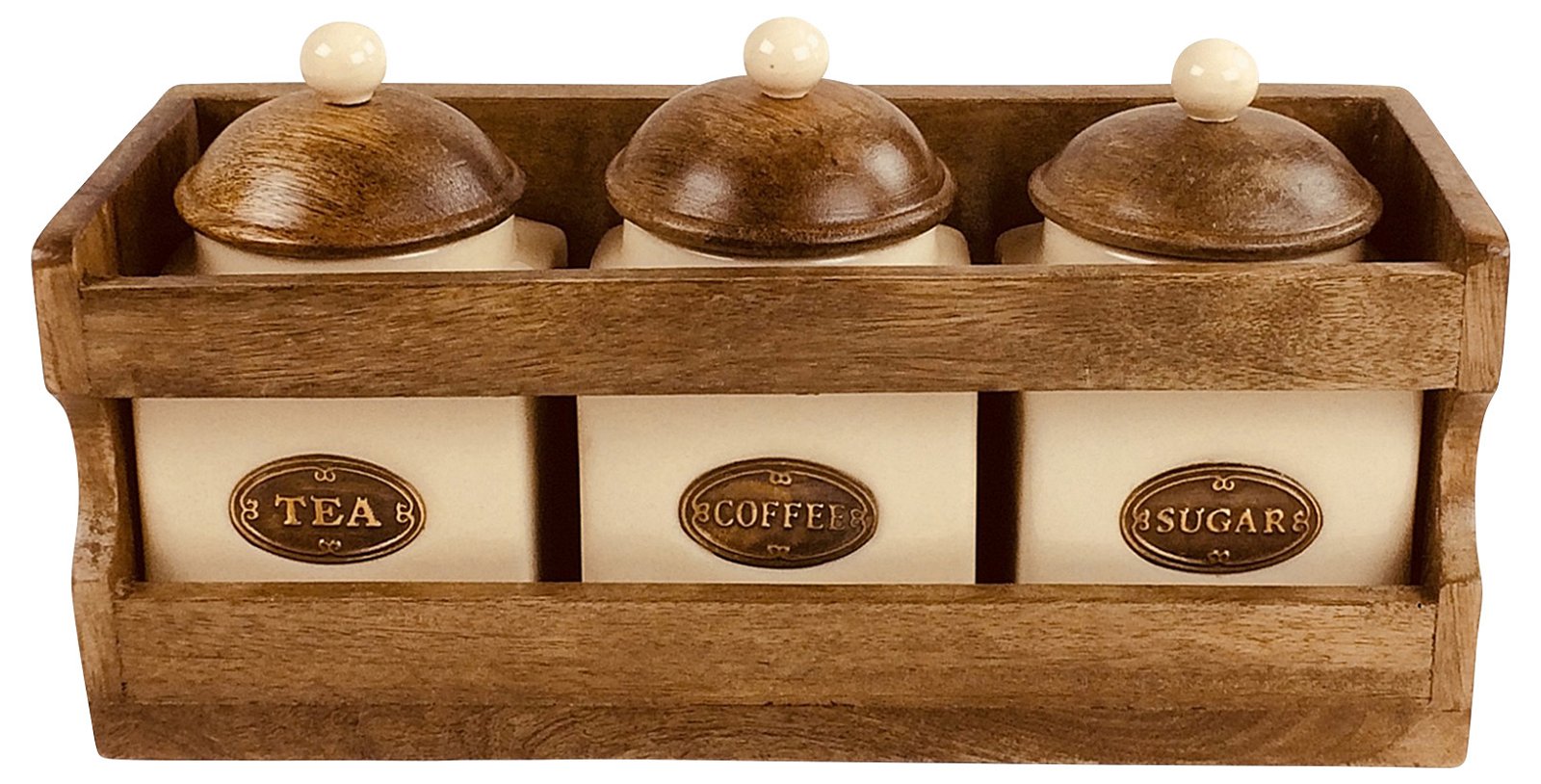 Wooden rack holding three ceramic jars each with TEA, COFFEE & SUGAR printed on the front. The jars have wooden lids ceramic knobs and rubber seals to keep them air tight. The wooden frame holding the jars is either free standing or wall mountable. Each jar measures W9.5cm x D9.5cm x H15cm. The opening diameter of the jars are 6.9cm. The lid diameter is 8cm. The overall size is 32.5cm wide, 13cm deep and 16.5cm heigh. Can be free standing or wall mountable.